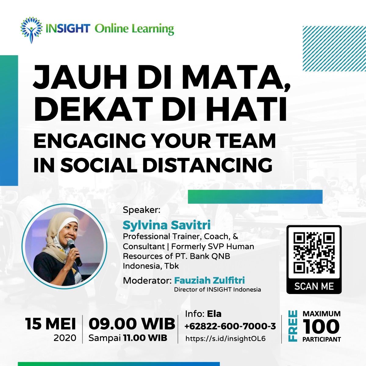 Sesi INSIGHT Online Learning 06 akan mengajak Anda mendiskusikan bagaimana menjaga motivasi dan produktivitas tim di saat semuanya harus saling berjauhan. INSIGHT Indonesia akan menghadirkan Ibu Sylvina Savitri, seorang Professional Trainer, Coach, & Consultant, yang pernah menjabat sebagai SVP Human Resources di PT. Bank QNB Indonesia, Tbk. Tentunya dengan tetap menghadirkan moderator Ibu Fauziah Zulfitri, Founder & Director of INSIGHT Indonesia.